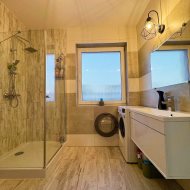 Cały dom ogrzewany jest pompą ciepła, a ogrzewanie podłogowe rozprowadzone zostało w każdym pomieszczeniu, co zapewnia wysoki komfort cieplny i niskie koszty utrzymania.