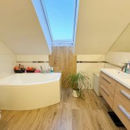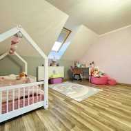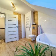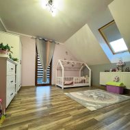 Piętro zapewnia idealną przestrzeń prywatną dla całej rodziny. Do dyspozycji są dwie sypialnie, pokój dziecięcy, pokój gościnny lub gabinet oraz komfortowa łazienka z wanną. Uzupełnieniem jest poddasze użytkowe, które daje wiele możliwości aranżacyjnych— od strefy relaksu, przez domowe biuro, po przestrzeń hobby.